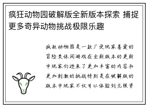 疯狂动物园破解版全新版本探索 捕捉更多奇异动物挑战极限乐趣